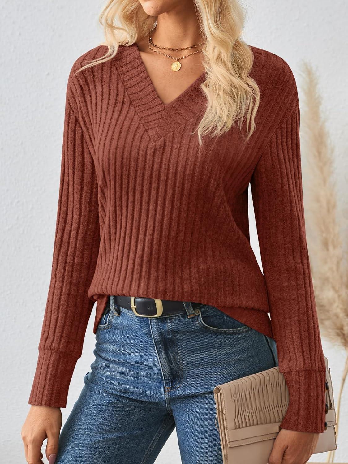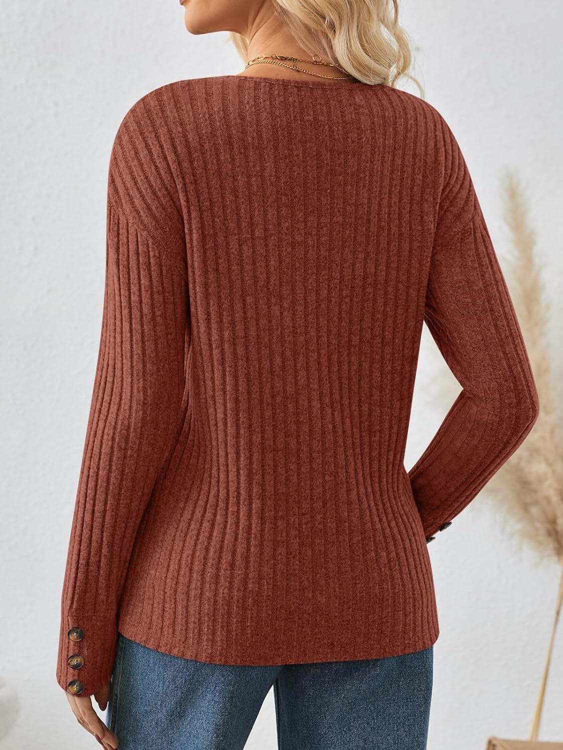 AUTOMET Womens V Neck Decorative Buttons Long Sleeve Shirt Fall Sweater Fashion Tops Dressy Casual Tunic Clothes Cute Trendy(Caramel)